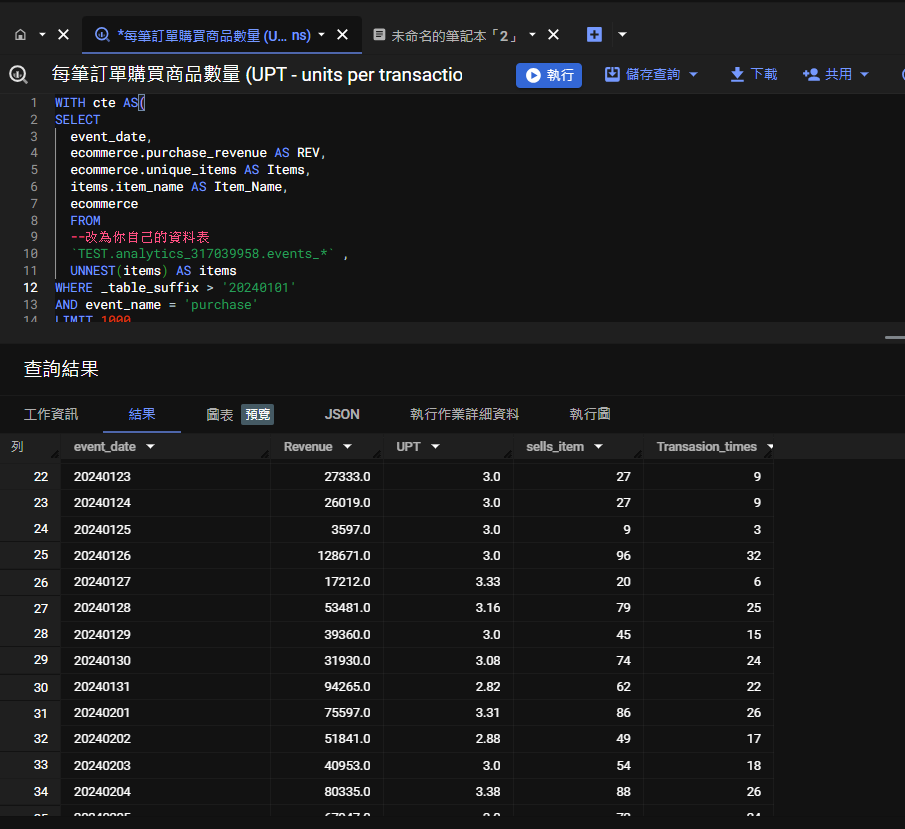 WITH cte AS( SELECT event_date, ecommerce.purchase_revenue AS REV, ecommerce.unique_items AS Items, items.item_name AS Item_Name, ecommerce FROM --改為你自己的資料表 `bigquery.analytics.events_*` , UNNEST(items) AS items WHERE _table_suffix > '20240101' AND event_name = 'purchase' LIMIT 1000 ) SELECT event_date, SUM(REV) AS Revenue, ROUND(SUM(Items) / COUNT(ecommerce.transaction_id),2) AS UPT , SUM(Items) AS sells_item, COUNT(ecommerce.transaction_id) as Transasion_times, FROM cte GROUP BY 1 ORDER BY 1 BigQuery 報表製作流程 生成報表的依序過程 透過BIGQUERY 與 GA4串連 => 透過SQL從BigQuery撈取資料 => 使用Looker Studio進行視覺化報表生成,或Python 引入相關套件進行視覺化報表生成。