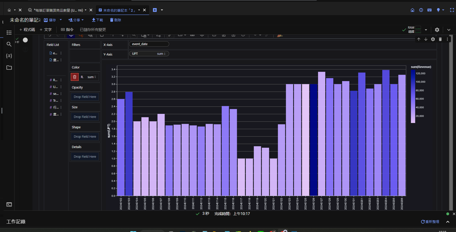 每筆交易購買的商品數量 是GA4裡面沒有的指標,透過BigQuey的撈取原始資料,並且先在BigQuery計算完報表,再輸出至PYTHON產生「 每日銷售額 + 每日每筆交易購買的商品數量 」的視覺化報表。