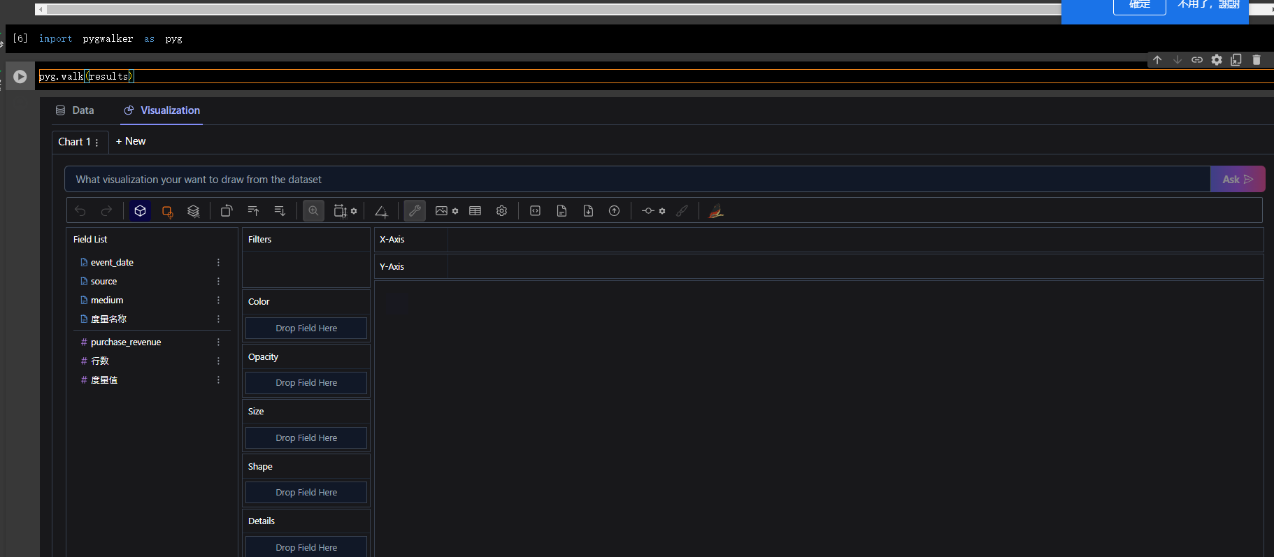 #輸入語法 import pygwalker as pyg pyg.walk(results) 引入上一步驟安裝的套件,並且透過pygwalker 套件中的方法,讀取我們Bigquery的資料。如上圖。 沒問題後他就會開啟一個UI讓我們製作視覺化報表。而資料則引用剛剛在BigQuery查詢好的資料。