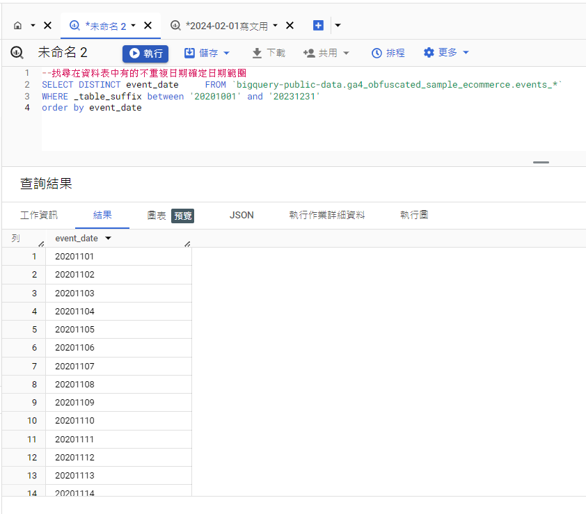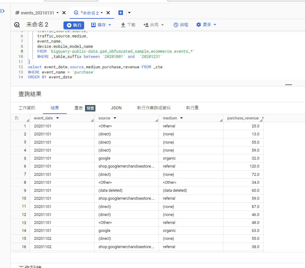 with _cte as ( SELECT event_date, ecommerce.purchase_revenue, user_pseudo_id, traffic_source.source, traffic_source.medium, event_name, device.mobile_model_name FROM `bigquery-public-data.ga4_obfuscated_sample_ecommerce.events_*` WHERE _table_suffix between '20201001' and '20201231' ) select event_date,source,medium,purchase_revenue FROM _cte WHERE event_name = 'purchase' ORDER BY event_date 如果不知道CTE是甚麼,可以 查看一下這篇文章 ,另外如果想要知道 其他CTE使用的也可以查看這篇 。這一個步驟是篩選明確我要的分析資料,讓我後續可以快速進行報表的製作;方便我查看欄位,同樣也能節省SQL的資料用量, 如果你好奇使用BigQuery的查詢價格,可以參考官方文件 。