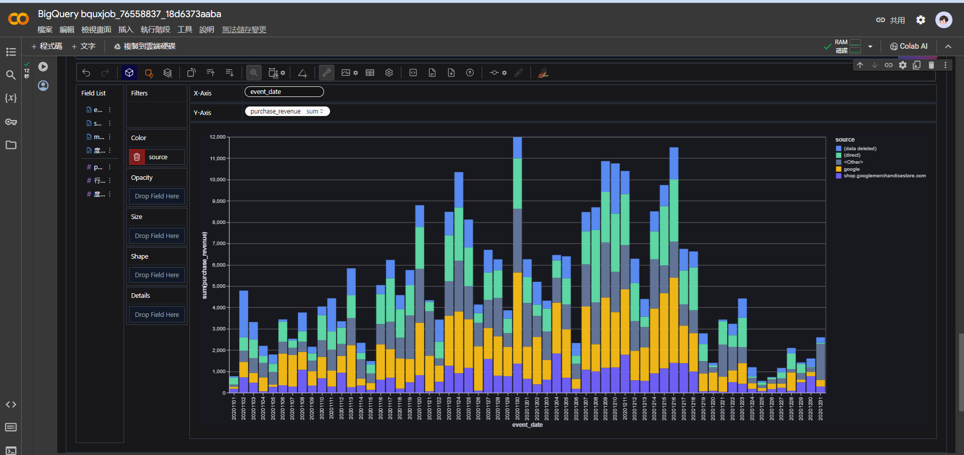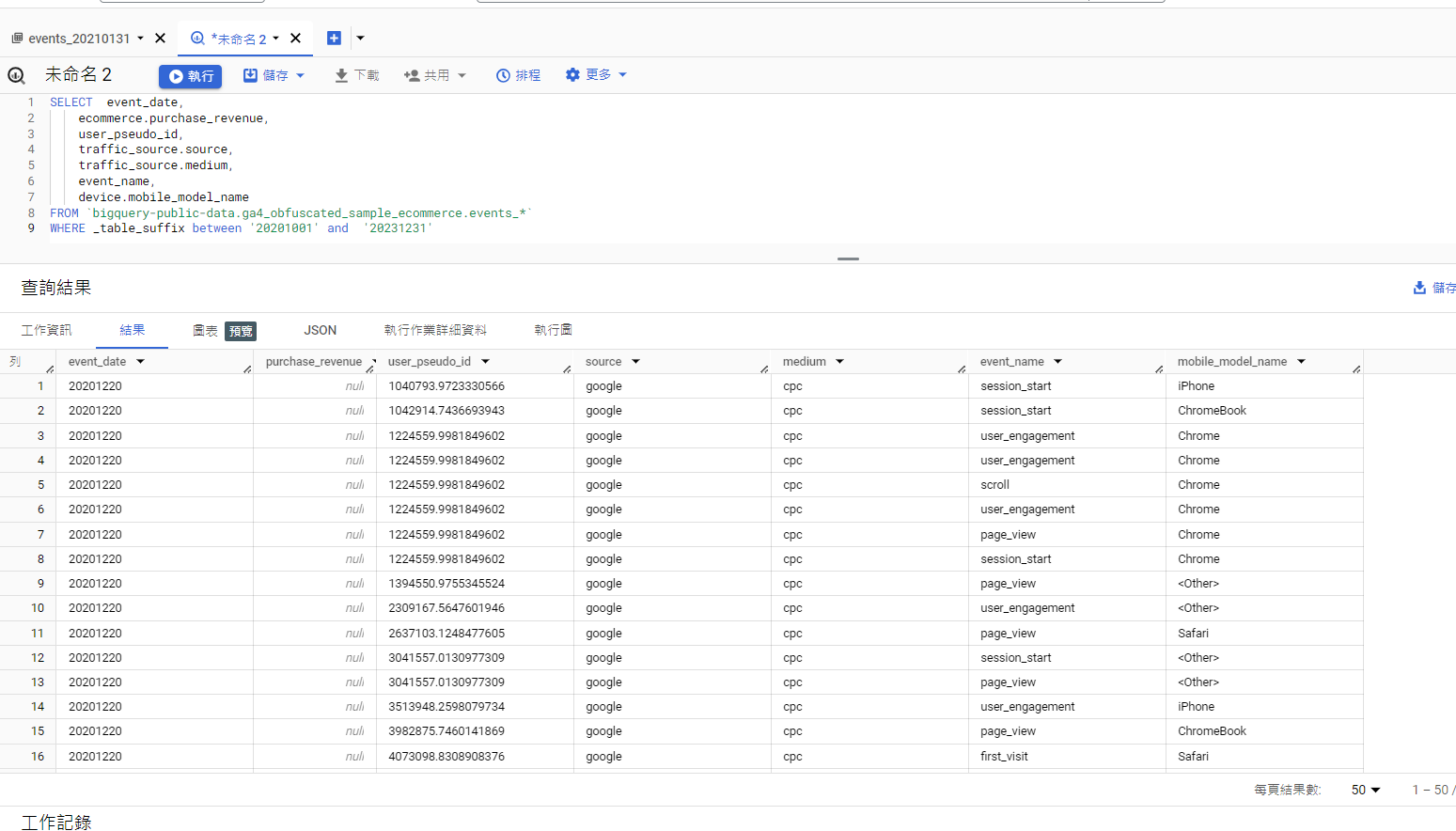 SELECT event_date, ecommerce.purchase_revenue, user_pseudo_id, traffic_source.source, traffic_source.medium, event_name, device.mobile_model_name FROM `bigquery-public-data.ga4_obfuscated_sample_ecommerce.events_*` WHERE _table_suffix between '20201001' and '20201231' 依照這次的篩選目標,我需要得知來源媒介,但我多拉了一些裝置、ID以備不時之需,如果你不想要,你也可以把這些不要分析的欄位刪除。