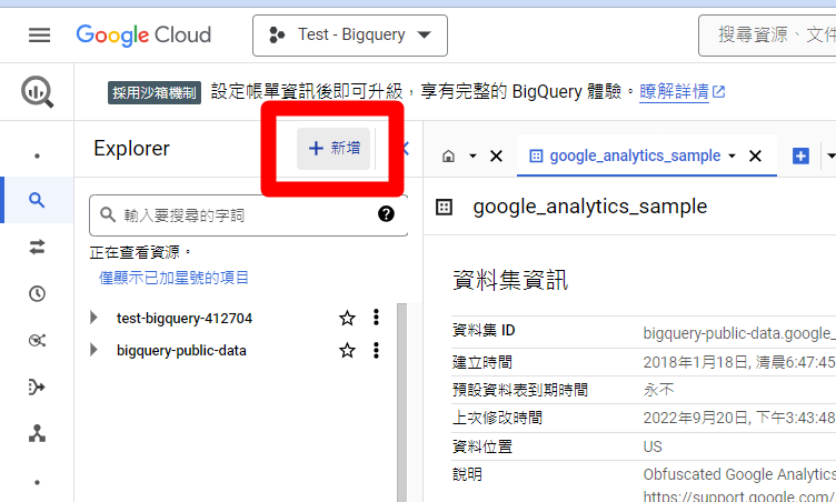 匯入GA4資料來源,如果你目前的BigQuery還沒有資料來源, 你可以透過匯入公開資料集 ,來進行BigQuery的查詢、SQL的練習。這邊匯入資料前面就有講述,因此快速帶過,如果不知道怎麼匯入資料集的,可以返回上一篇BigQuery資料匯入查看。