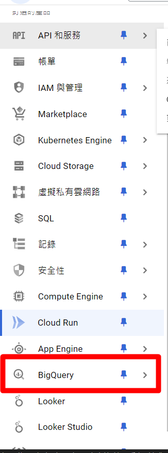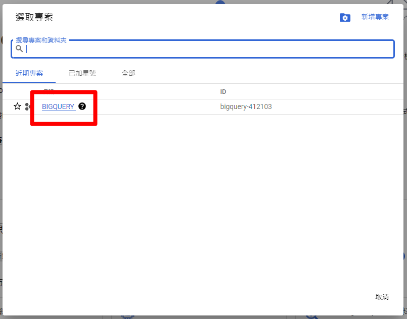 切換為你新建好的專案,並在選單中選擇BIgQuery。