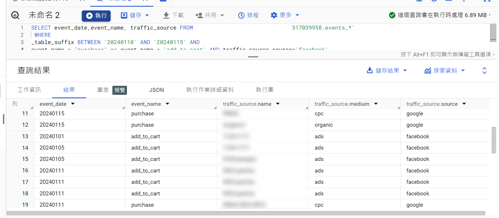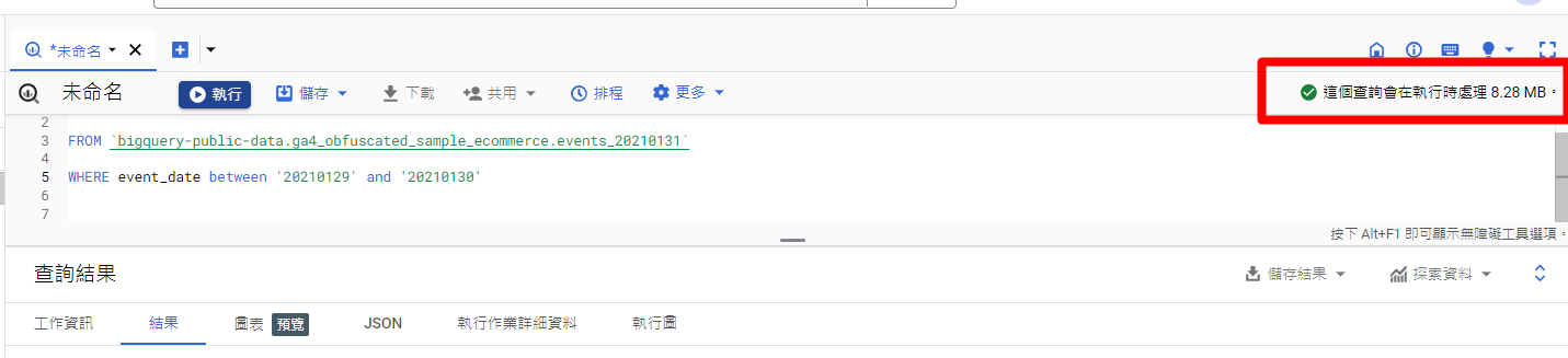 可不要以為1Tib很多,當你查詢的資料破萬筆時,每一次的請求基本上都會是好幾百MIb以上,甚至更大就會超過1GiB。基本上1TB的使用量對大企業來說,一下就會耗損完。因此需搭配 LIMIT的限制資料量,或是利用WHERE條件的SQL語法作為篩選 ,或是查詢必要欄位即可;以上都能節省用量消耗;右上角可以看到查詢時會使用的資料大小。