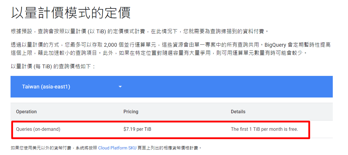 查詢計費:BigQuery以量計價的計費模式 (每 TiB)。採用這種定價模式時,系統會依據每項查詢處理的位元組數向您收費 。每個月可免費處理 1 TiB 的查詢資料。超過則以USD$7.19 / 每Tib 計費 。