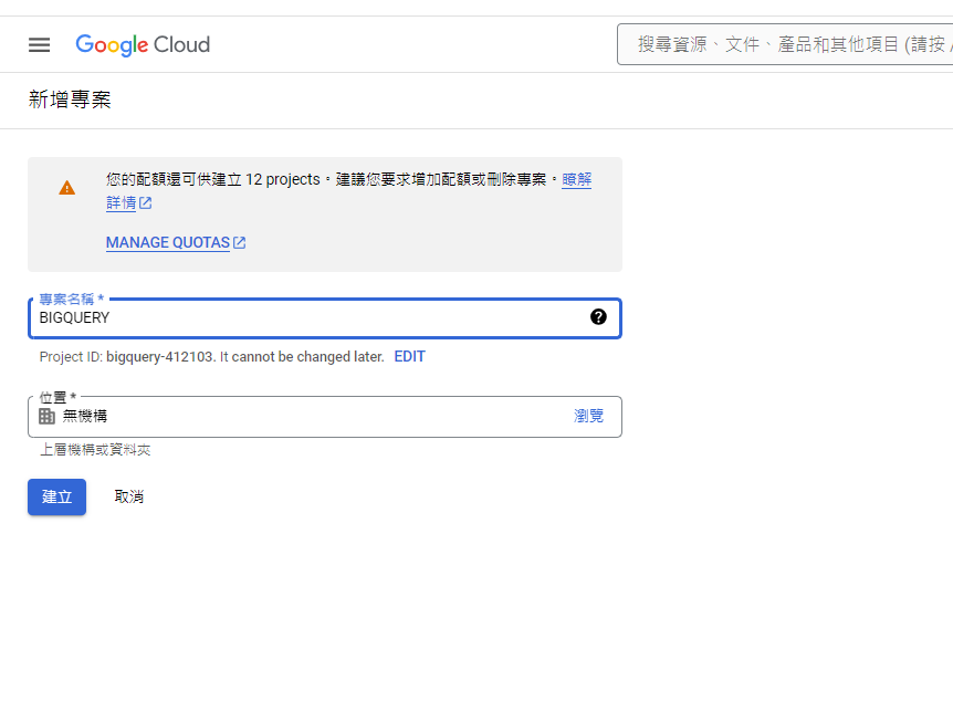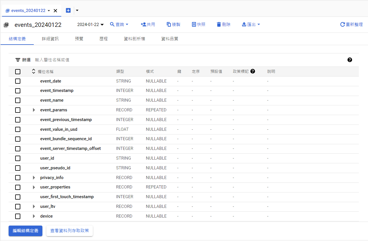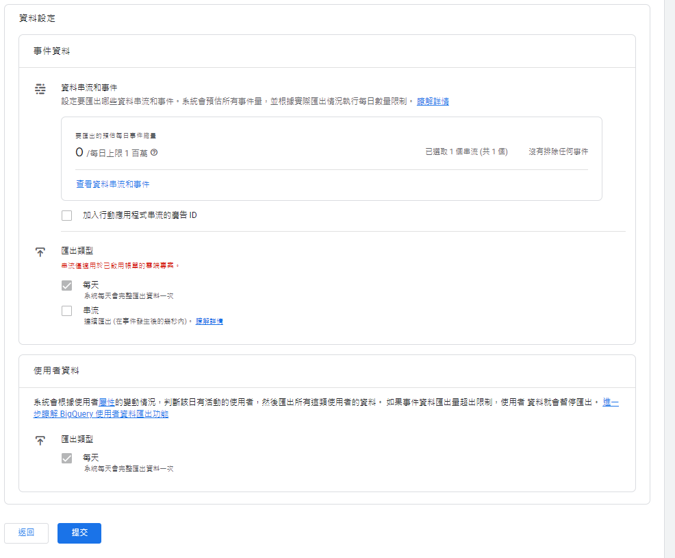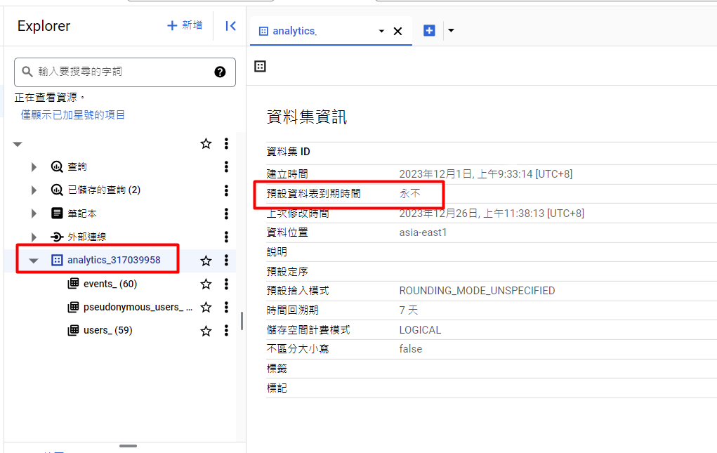 如果設定完BigQuery的資料,需要注意「預設資料表到期時間」是不是為永久,如果不是需要點一下旁邊的「編輯詳細資料」。務必專案要綁定付款資料,且啟用完整帳戶,才能設定為永久。