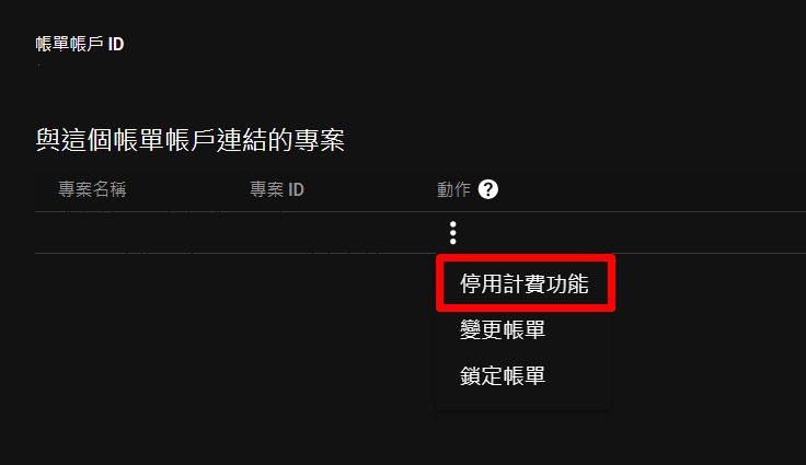 進來後,你可以把原先開始的專案,或是你全部正在開啟的專案,停用計費功能。一旦停用,你原本啟用的API,例如BigQuery, VM, Cloud Run 將有可能會受到影響。例如BigQuery你的資料將會無法開啟。