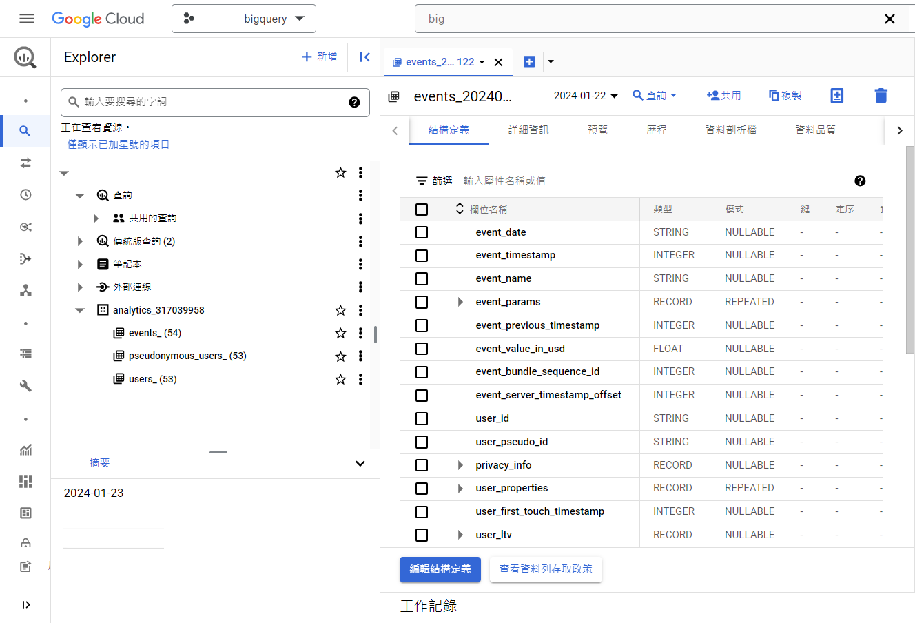 前往你的GCP對應的 BIgQuery專案,於選單中找到BIgQuery你就可以看到類似這個範例圖的資料。 如果你是剛串接好BigQuery,會需要等待1-2天,這裡才會有對應的資料。