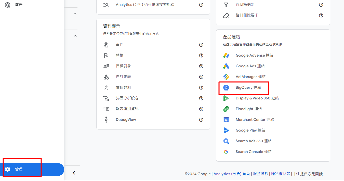 點選左下角的管理,找到產品連結中的BIgQuery。
