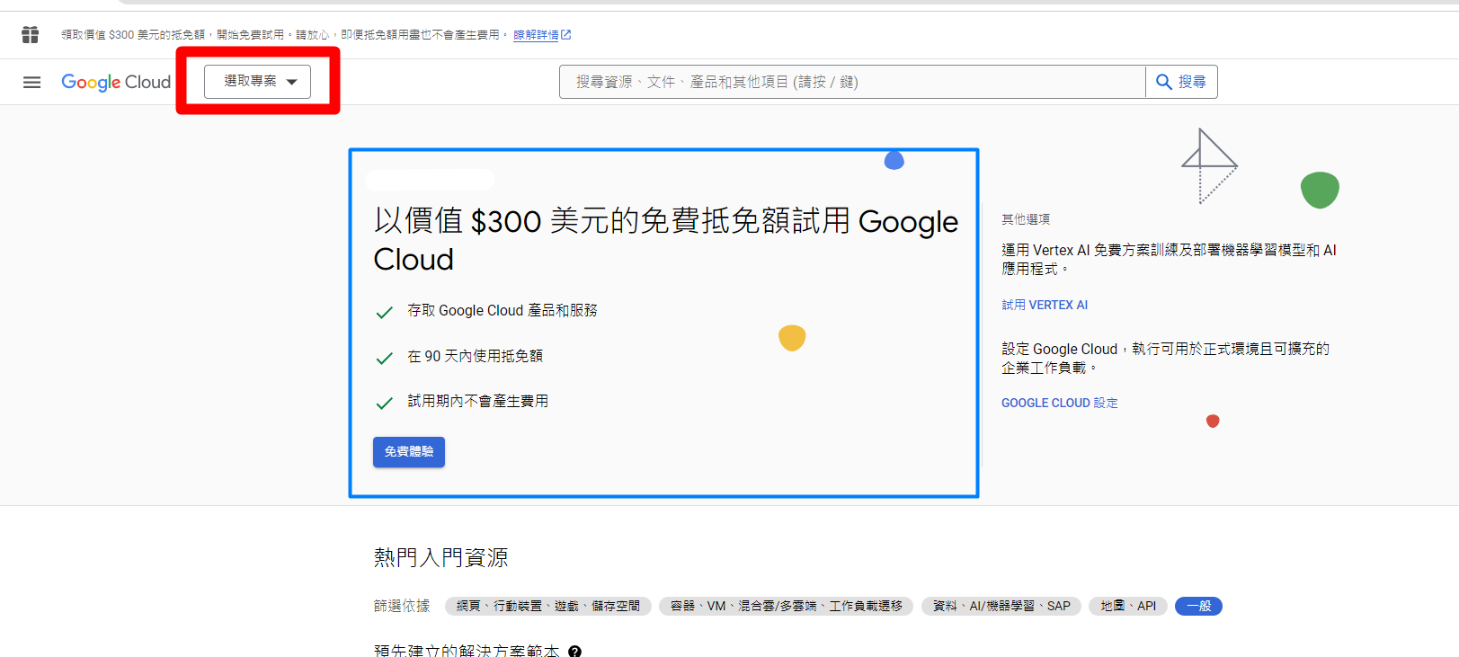 如果你從沒使用過GCP,你需要先建立一個BIgQuery的專案。以供未來打開BIgQuery時會使用到。藍框處則是可以先開通帳戶領取300元美金。如果你沒有使用到就可以不用開通。但未來說不定會強制BIgQuery也需要使用付費專案。