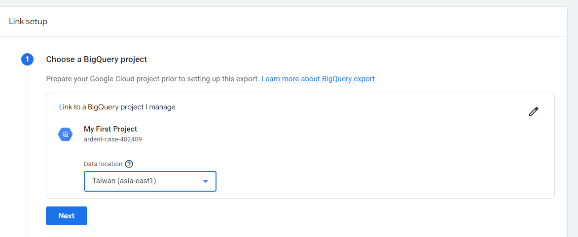 選擇你剛在GCP創立的專案,還有選擇資料地區;這邊直接選擇台灣。