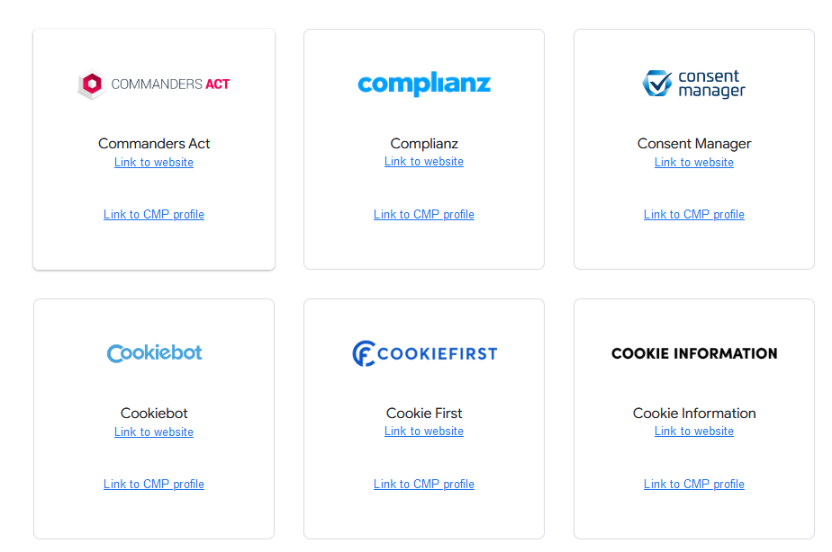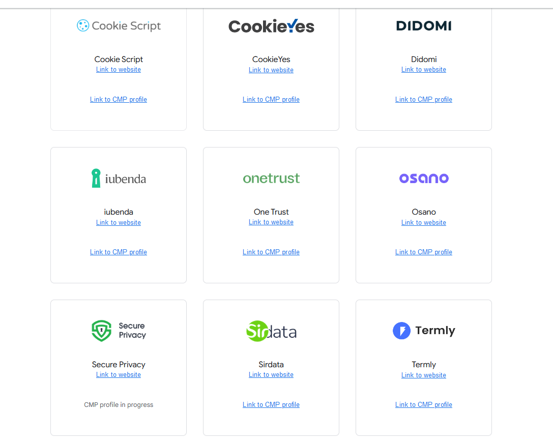 以下兩張截圖是來自 Google推薦的官方認證CMP(Consent Manager Platform)合作夥伴 ,我只截取其中兩張,還有其他不同的CMP平台。每一個平台的收費方式都不同,如果你也要埋設CMP的建議可以參考多間價格、埋設方便度、管理彈性度作為考量。本次教學會使用 Termly 作為操作範例。另外也推薦 Cookiebot ,因為這兩個也都有GTM的官方範本,所以實施Consent也會很方便許多。