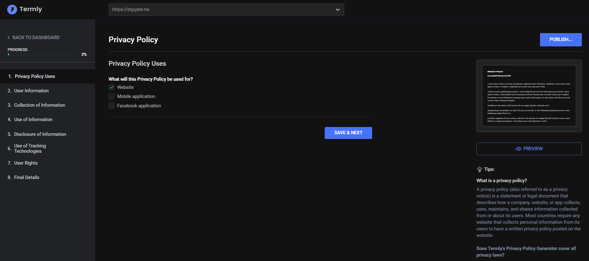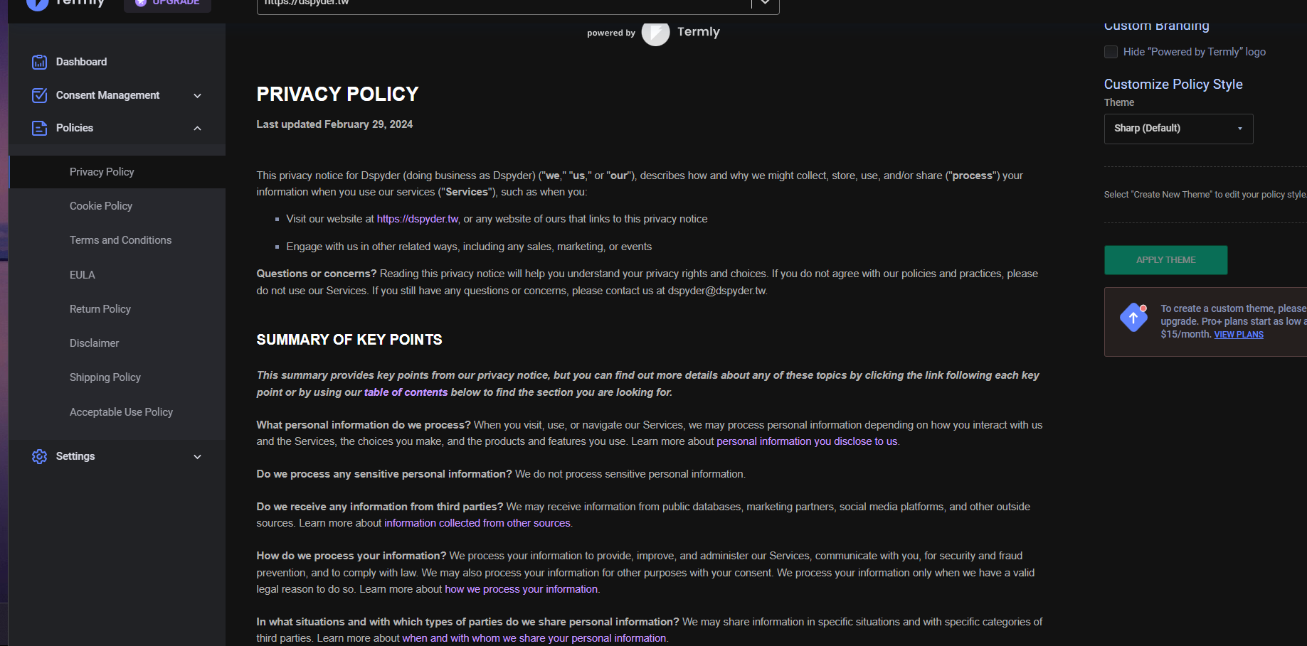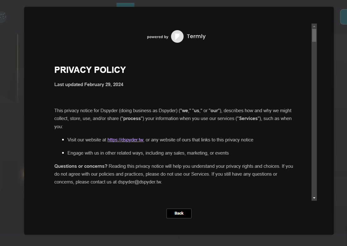 此為Termly需要先詢問你相關的問題,Termly這邊所詢問的問題,都是符合EU / GDPP的法規,但問題比較多一點,所以務必耐心填完。完成後 Termly會自動幫你產生一分Privacy Polycy的文件 ,提供網站使用者閱讀。如上面第二張圖。
