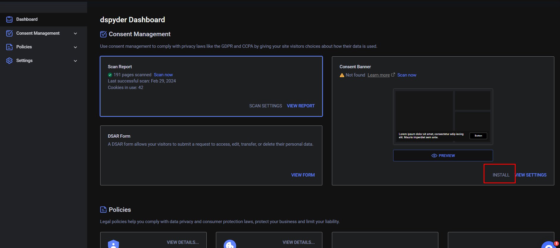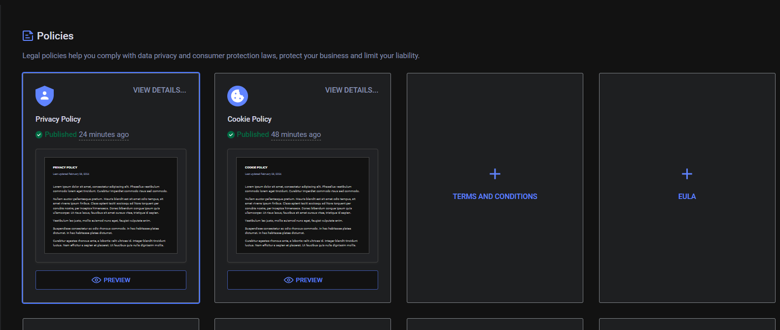 點選Dashboard下方的「Privacy Policy, Cookie Polily」,Termly會幫你製作隱私權政策、Cookie政策。繼續往下閱讀,會有相關的隱私權製作的說明。