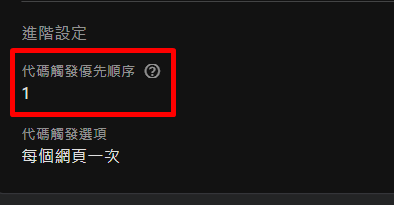另外我也會將Cookie Banner的觸發順序設定為1 (最優先)。其他追蹤代碼設定>1,例如10。