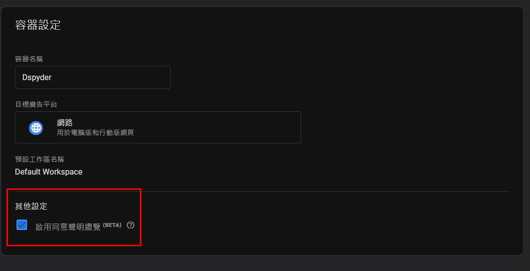 前往你的GTM「瀏覽器」容器,將啟用同意聲明總覽打勾。這樣才會在GTM首頁中的代碼,看到同意聲明目前代碼設定的狀況。