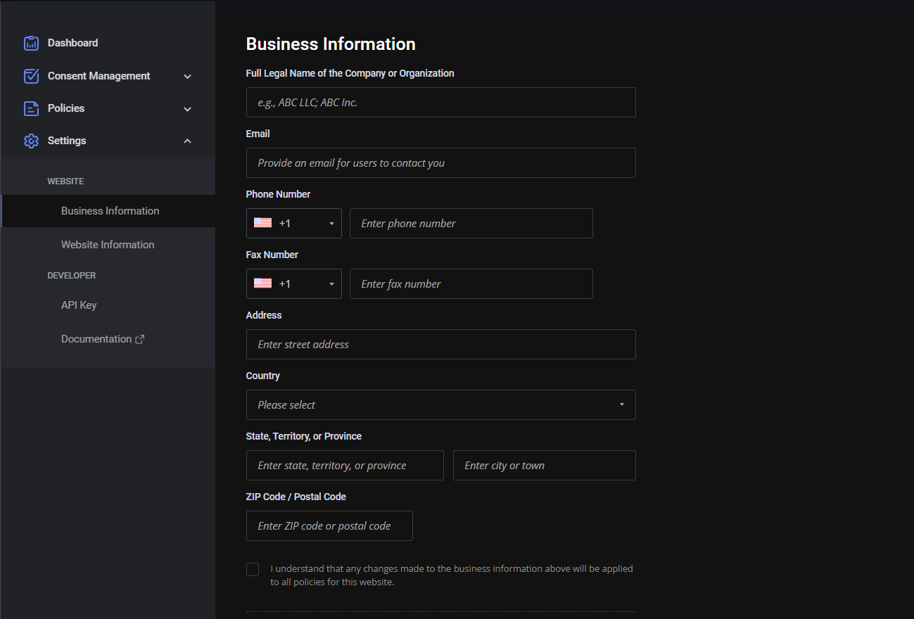 註冊完成後,Termly會要求你填入基本的企業資料,這邊再依照你的資料填入即可。