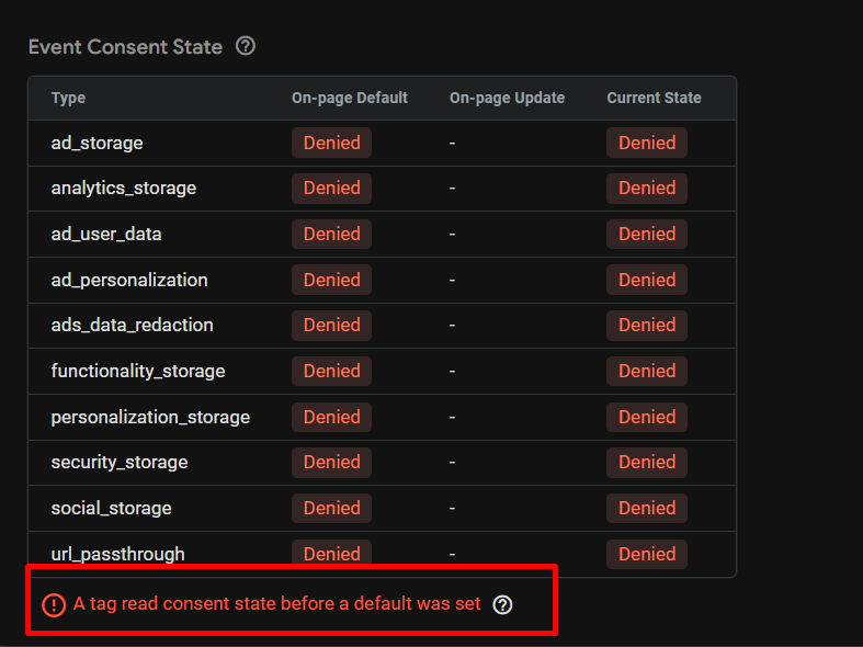 如果你在設定ConsentMode的時候有以下錯誤「A tag read consent state before a default was set」。