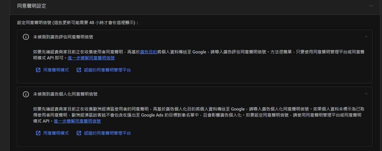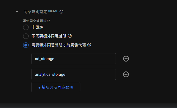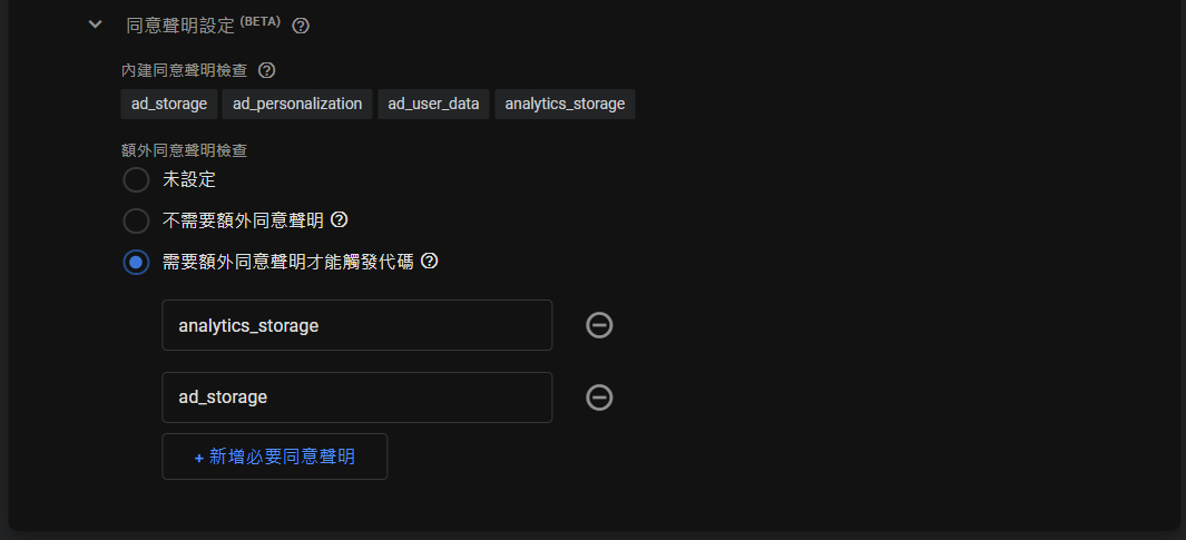 這邊會分成「內建同意聲明」、「額外同意聲明」,基本上只要是Google的代碼,內建同意聲明都會有一些設定。而非Google的,像是臉書、自訂HTML則都不會有內建同意聲明。