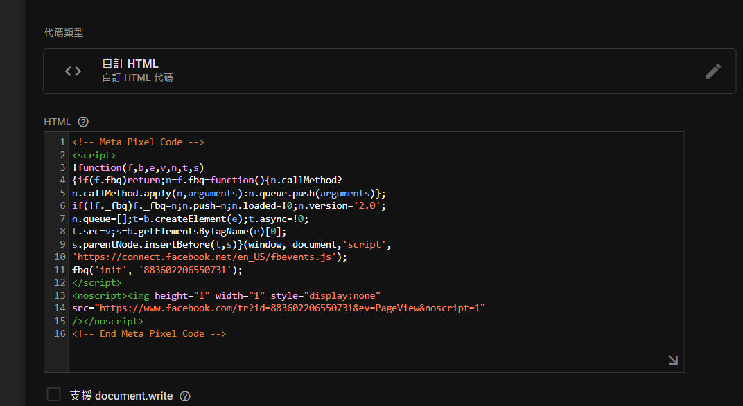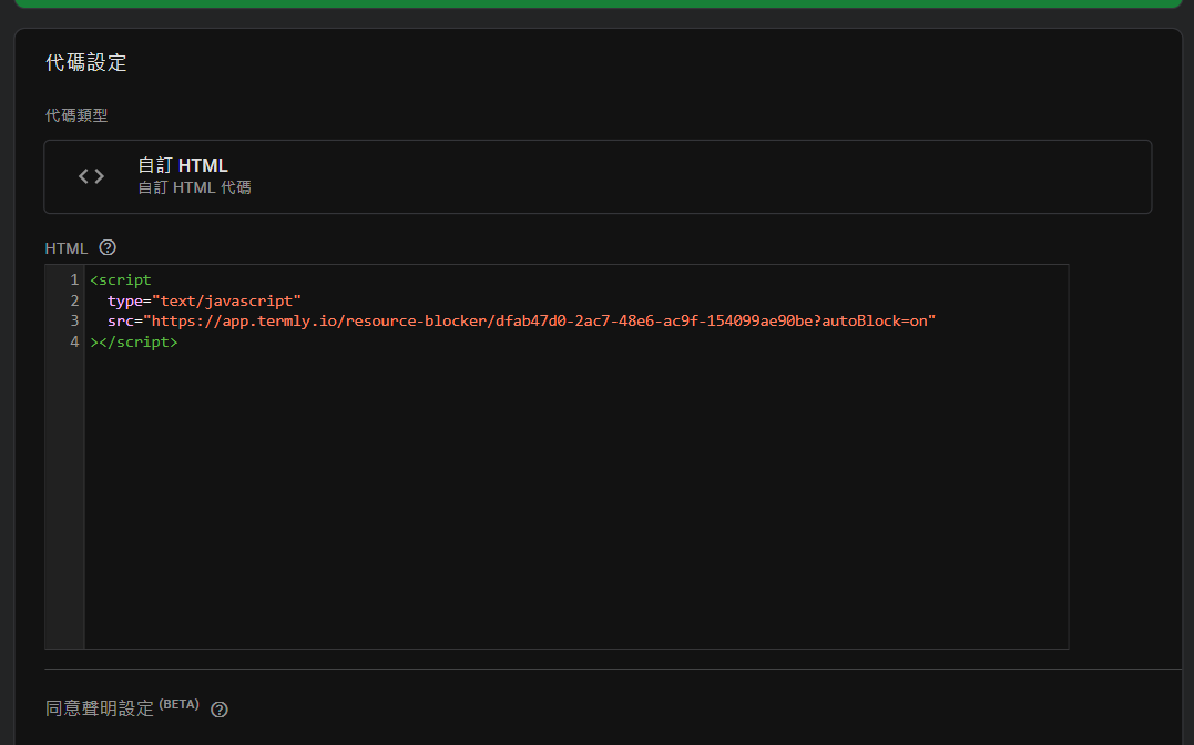 上方的自訂html,因為這代碼本身沒有自帶「內建同意聲明」。所以我們需要再給予他額外同意聲明。