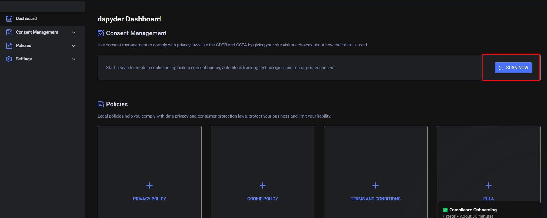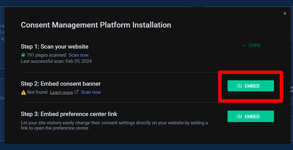此步驟重要,務必確定自己有完成上方 - Dashboard的Scaning 。他會進行你網站的掃瞄,查看有幾個頁面、是否有Cookie Banner。