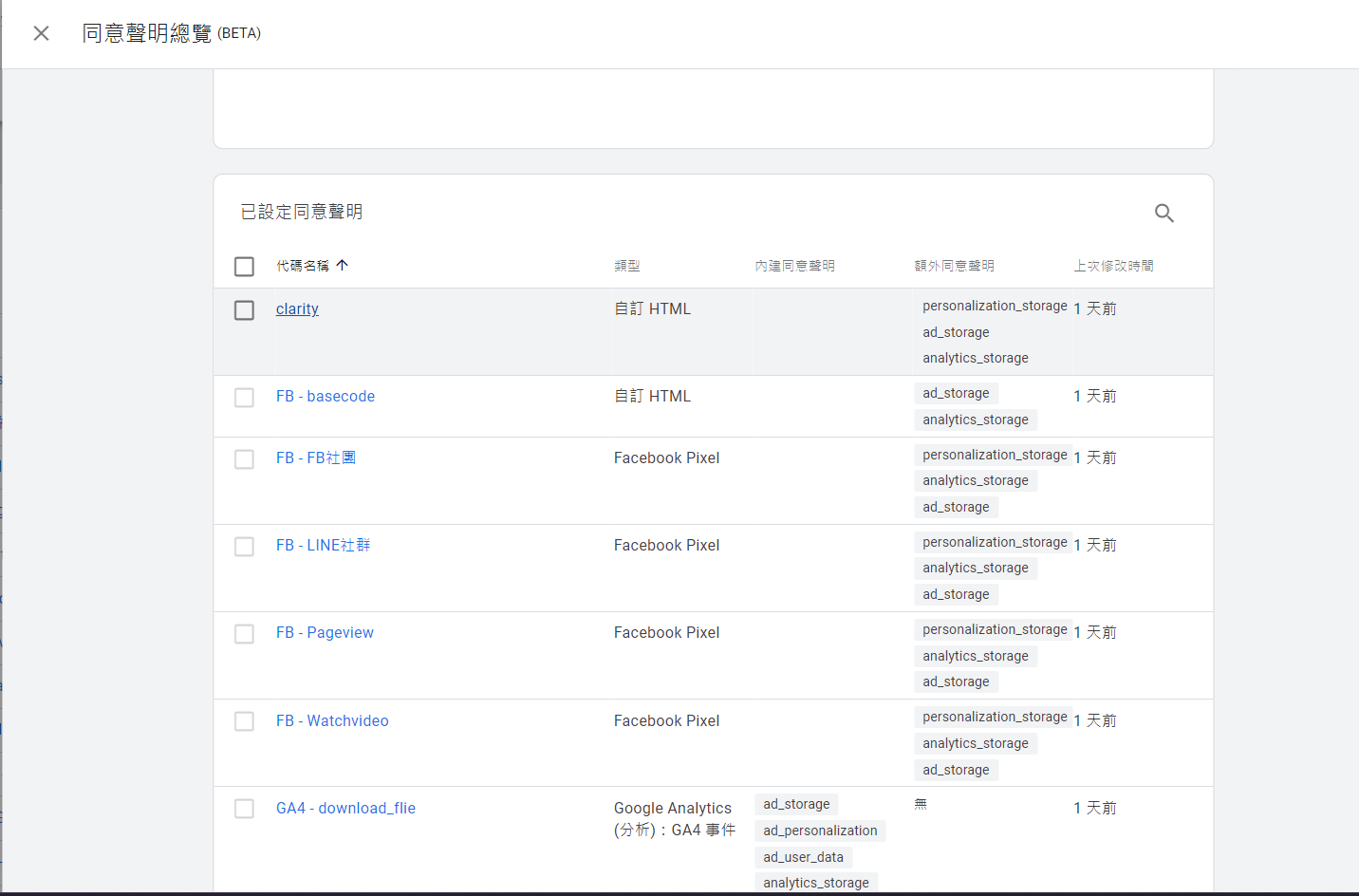 點選進入同意聲明總覽,這邊就使GTM把你目前全部的代碼,劃分成為兩大區塊「已設定同意聲明」、「未設定同意聲明」。這裡也是 方便管理各個事件代碼 ,避免有些事件沒有設定完整。