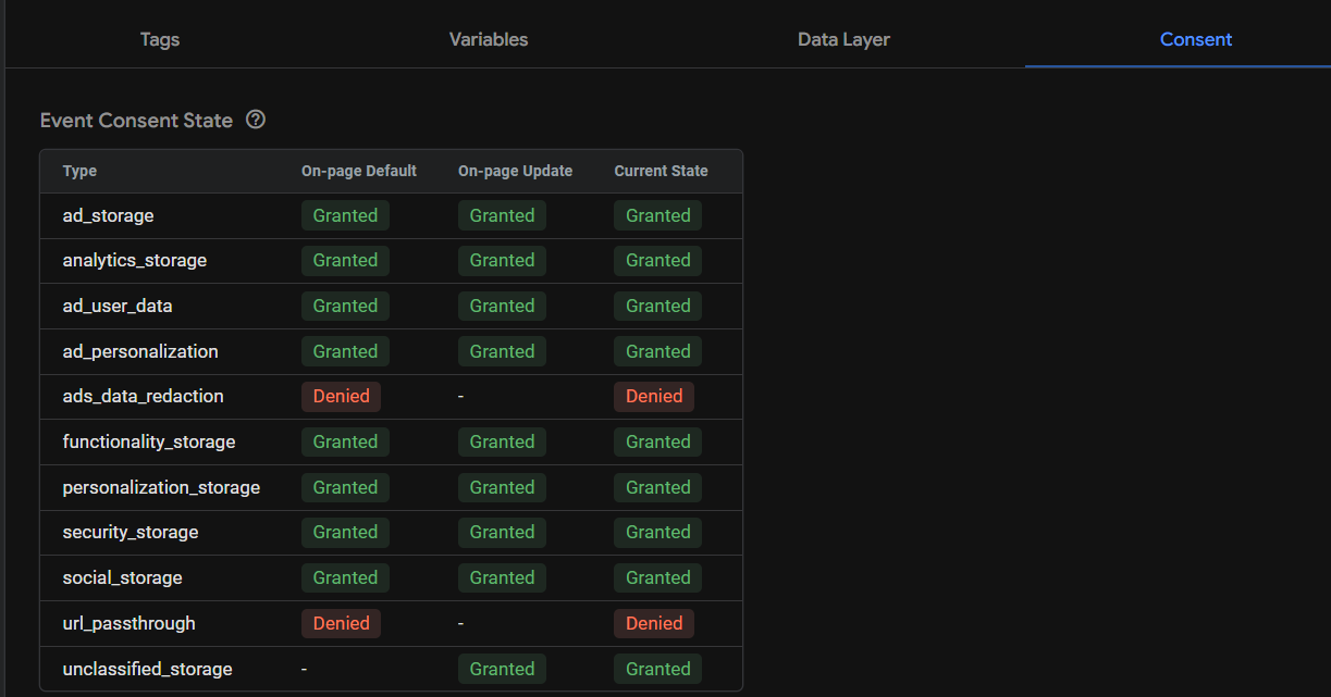 當你點選已經觸發的代碼,裡面的Consent,可以看到目前的Consent同意狀態。Default代表一開始預設為Denied;On-page-Update是當你點選Cookie Banner後的更新狀態;Current State是目前使用者瀏覽頁面的Consent狀態。