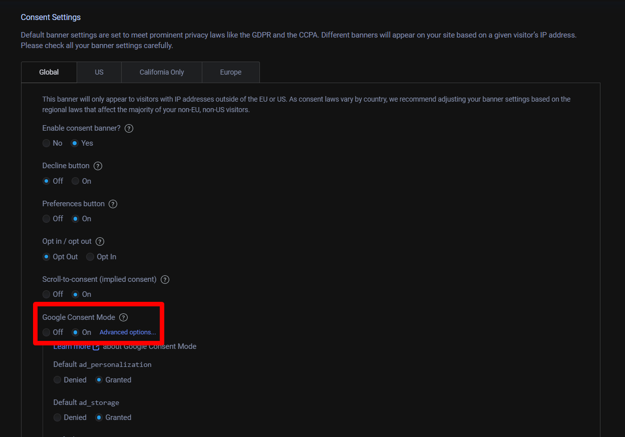 務必也要把最下方的Google Consent Mode開啟為On。