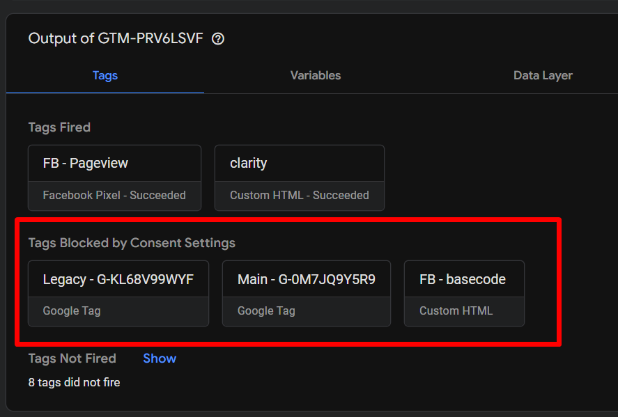 設定完成後, Consent同意徵求就是第二個觸發條件 ,因此你所有GTM的代碼,都要同時符合觸發器、Consent徵求的內容。不然就會像上方一樣被擋住。