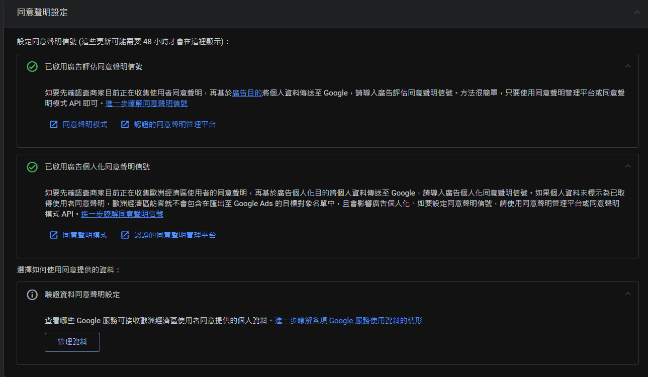 內建同意聲明的功用就是,這個範本會讀取特定Consent訊號 (有內建範本的都是Google相關的代碼)。當使用者如果拒絕,這個代碼一樣會正常運行,但 會以不一樣的方式進行追蹤;發送特定CookieLess Ping ,以進行Google提供的模組數據擬合。執行此步驟,也就是俗稱的Advanced Mode,務必確認熟悉當地的法律,對於使用者案拒絕,又繼續發送數據這個行為,其實頗有爭議。如果你想要了解功能的各自意思,也可以 參考這一篇官方文件 。