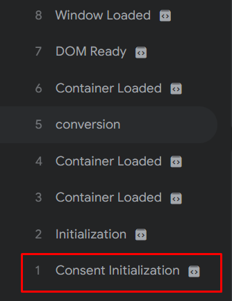 GTM在很久前就已經開始有Consent同意模式的埋設,觸發順序Consent Initialization就是為了ConsentMode而生。如果在第一關ConsentMode拒絕,那後續觸發的代碼都會受到影響,也 因此Consent代碼務必永遠在最前面 。