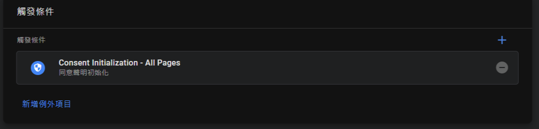 將複製到的JS程式碼複製到GTM的自訂HTML中。觸發條件選擇「 Consent Initialization - All Pages 」。