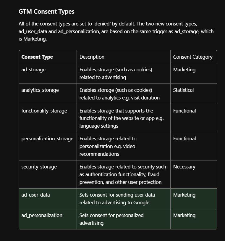 2024年1月因應組織政策,GOOGLE開始採用ConsentModeV2,要求所有網站、APP只要使用者在EEA 或 UK,就必須採用使用者同意聲明模式。 GOOGLE官方文件表示 : "If a user from the EEA is using your website or app and you measure user behavior with Google tags, you need to pass through end-user consent choices to Google .