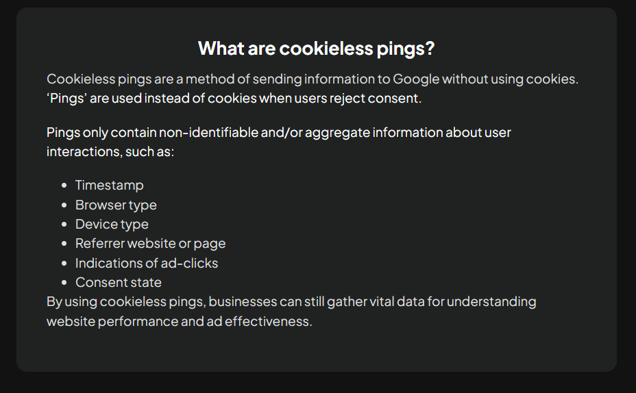 在以前的Consent - Basic Mode 為當使用者如果拒絕收集,網站就無法拿到完整的使用者資料。而GOOGLE也有推出Consentv2,除了新增兩個訊號「ad_user_data」、「ad_personalization」,這次也帶入新的概念 - Advanced Mode。Advanced模式下,使用者如果按denied, Google會發送一個無識別資料的CookieLess pings,例如「瀏覽器、時間戳、UserAgent」等,藉此幫助GA4、GADS進行數據擬合 。下方內文有更多一些coockieless pings的詳圖說明。