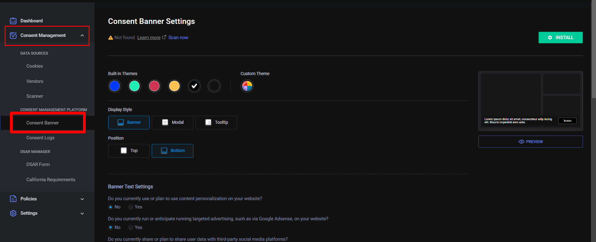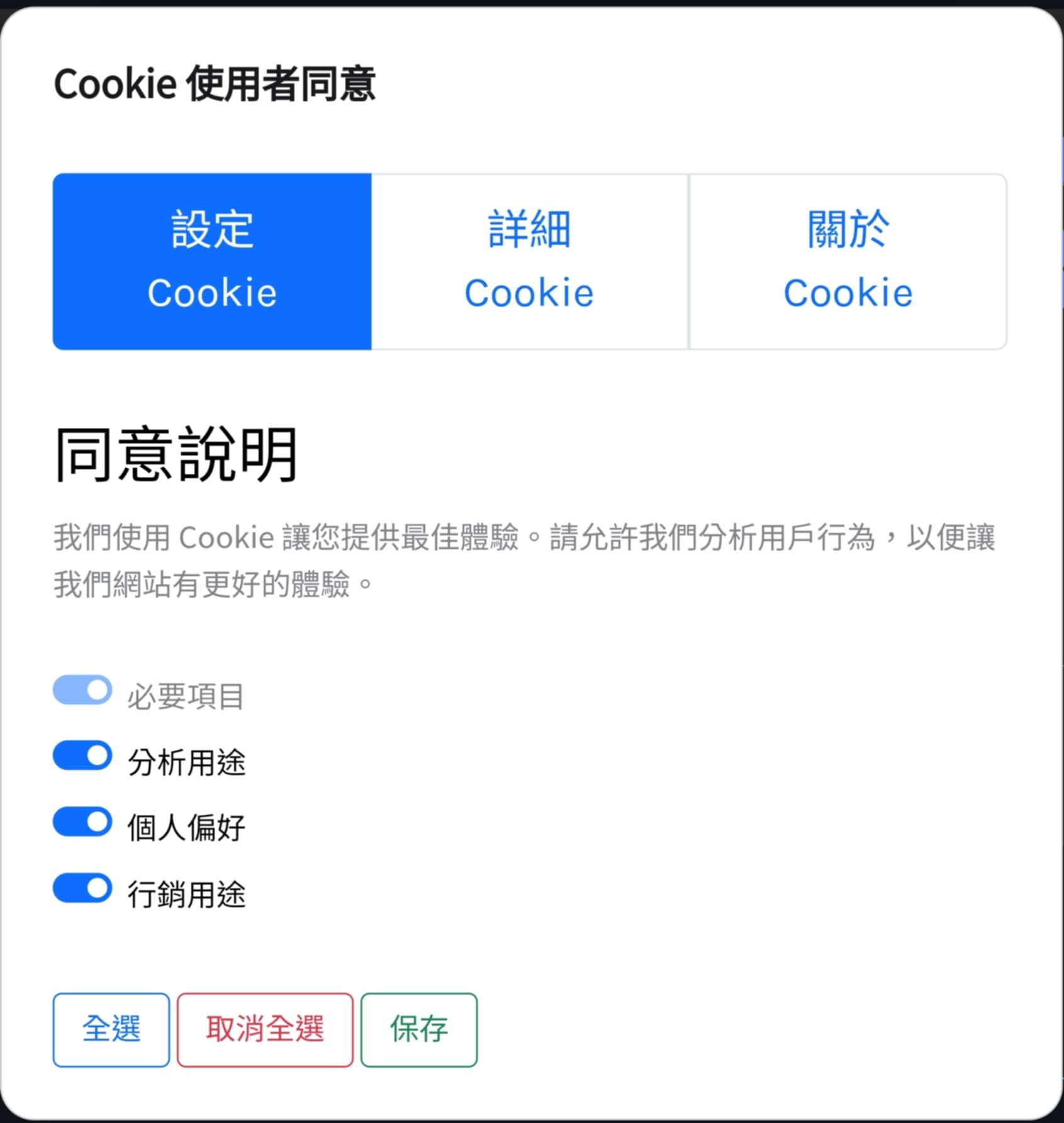 完成Cookie Banner的埋設後,接著可以前往Consent Management中的Cookie Banner進行美化、外觀、預設設定的調整。這邊美化、外觀都可以依照企業的偏好進行設定。