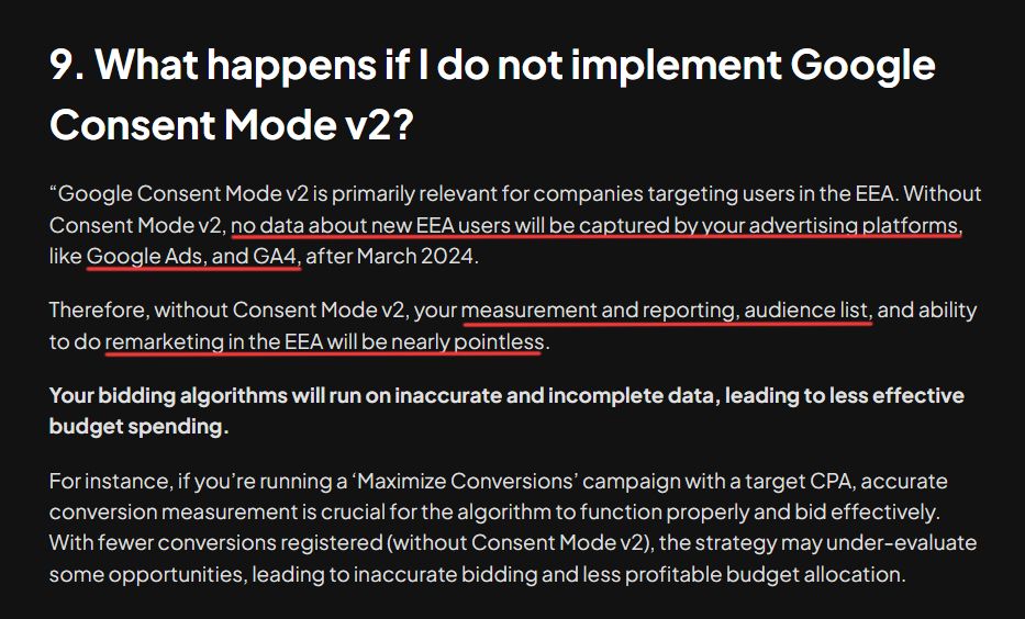 如果你的網站使用者有包含「EEA區域」、美國特定幾個州區域,那你的網站就需要使用ConsentMode。如果沒有ConsentMode,而網站又繼續進行數位行銷的活動,包含投廣告、數據分析等。會導致 無法使用受眾功能、GA4報表影響、廣告的再行銷功能,甚至GADS的競價能力也會大幅受到影響 ,再嚴重一點,可能也會影響品牌商譽、受到法規制裁等。