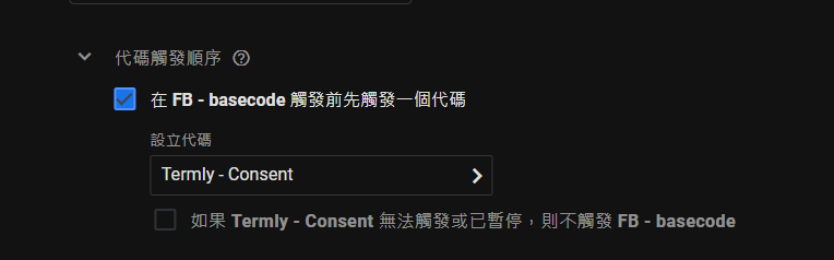 前往GTM設定全部的代碼 (除了Consent本身代碼以外)。將觸發順序都設定在Consent代碼之後。