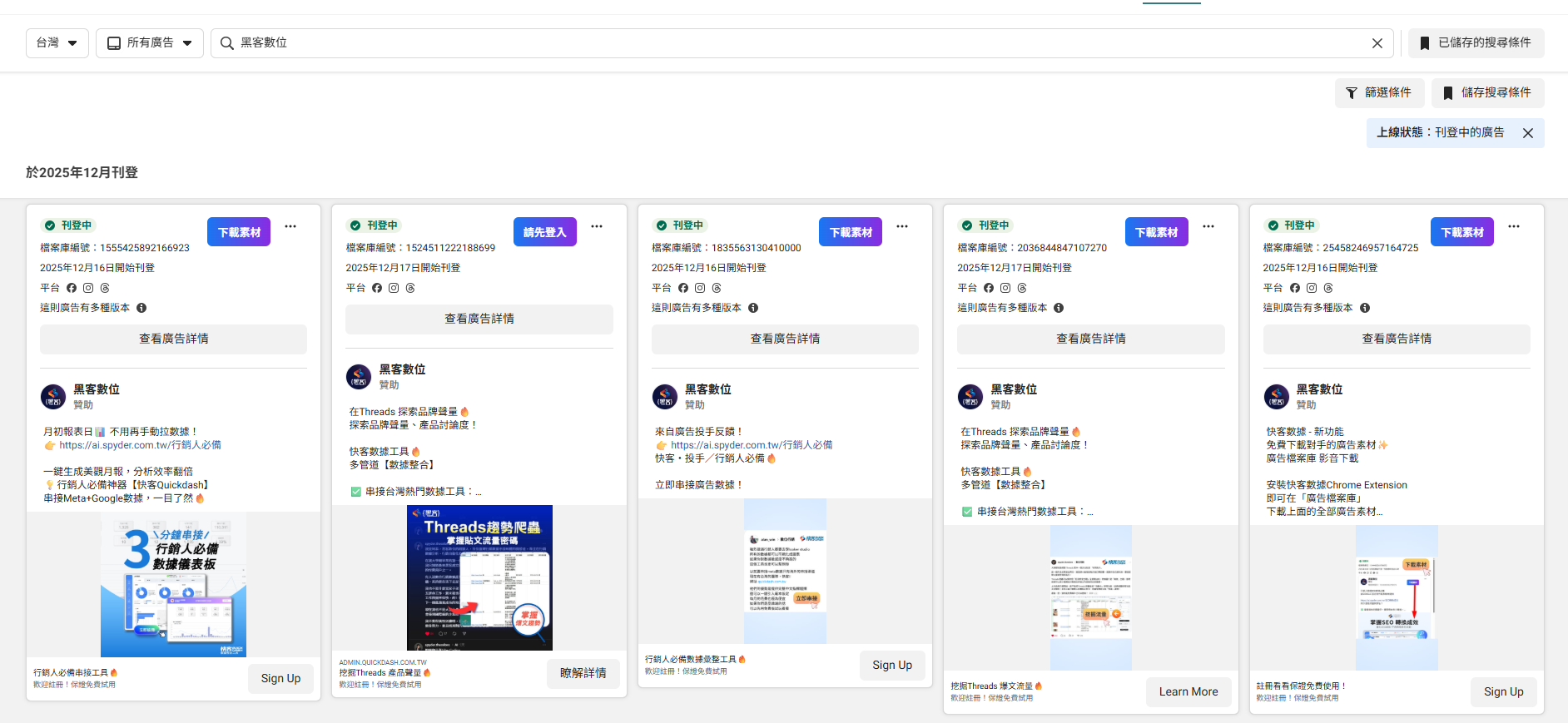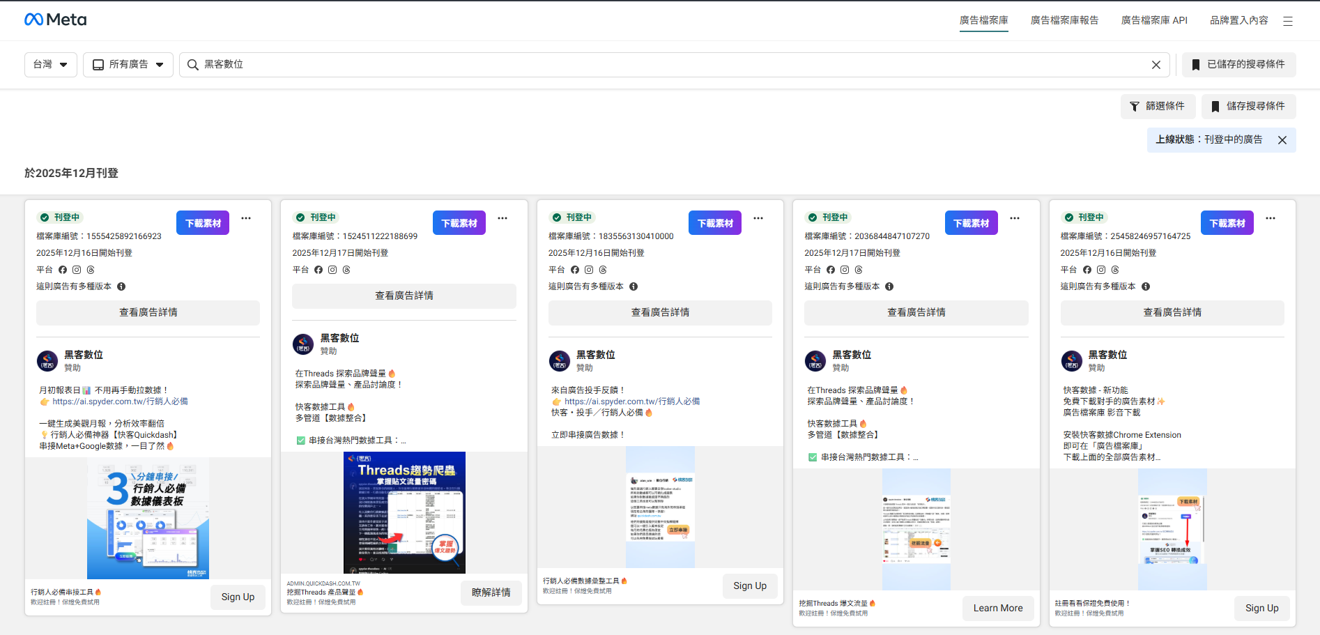 如何下載臉書廣告檔案庫的廣告素材? 一鍵META 廣告素材。透過快客數據擴充應用,可以無限抓取對手的廣告素材。包含影片、圖片、輪播類的廣告素材通通支援。只要登入快客即可使用!立即註冊 100 % 免費使用!