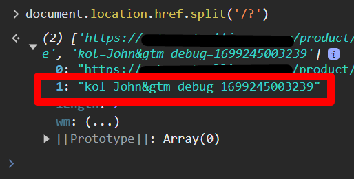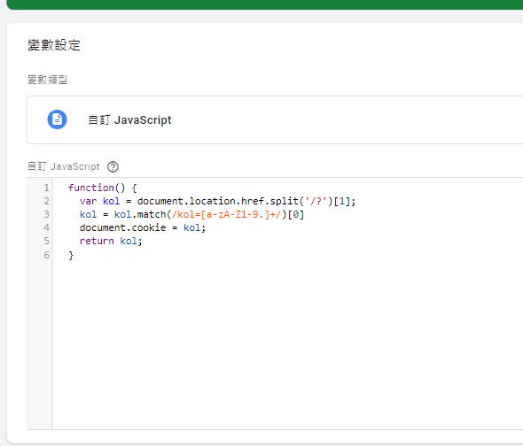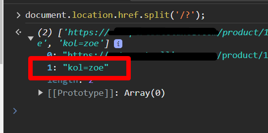 document.location.href.split('/?'); 透過網址的「/?」為分界點,篩選出帶有「kol=xxx」的字串,可以直接照範例上面的輸入,但務必確認你的KOL項目在第幾項。
