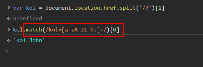 var kol = document.location.href.split('/?')[1] kol.match(/kol=[a-zA-Z1-9.]+/)[0] 宣告完變數後,利用本身物件的屬性match,將kol去除所有不要的資料。如範例圖,但你的網站參數可能跟我不全然相同,所以還是要依照網站內容而變動。