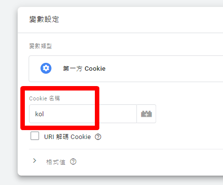 新增一個COOKIE變數,名稱打上你在前台所設定的名稱,不一定是kol,要看你輸入甚麼。