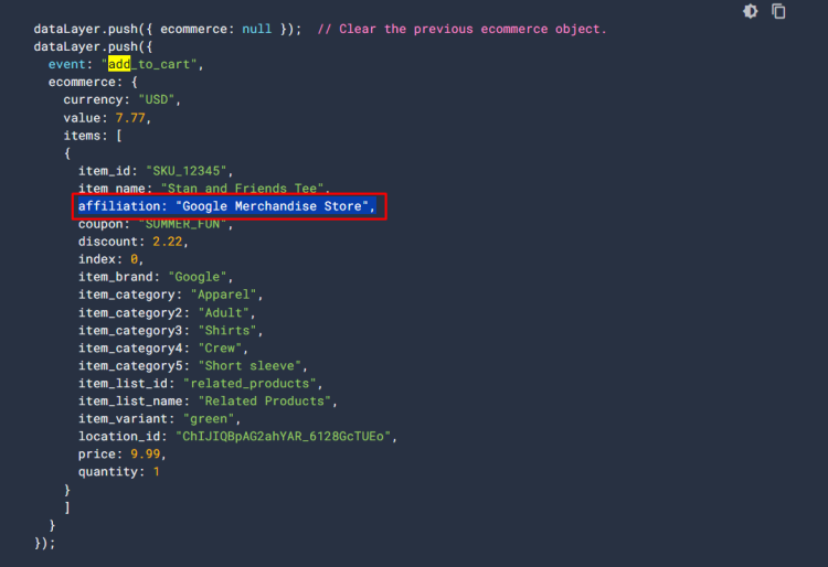 電子商務事件中的Affiliation屬於選項參數 ,因此在埋設的過程中,埋設人員可依照公司情況將 Affiliation 給傳入至GA4。 Affiliation 用於追蹤聯盟推廣的電子商務事件,如果你的公司是 使用自架網站,並且時常會有跟網紅、KOC合作 ,這參數你就可以考慮連帶傳給GA4。
