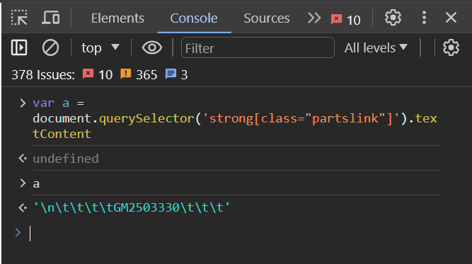 document.querySelector('.strong[class="partslink"]').textContent 但會拿到圖片範例中,一長串的東西,其中有一些空行、符號,這些都不是我們所需要的。因此需要下一步,透過REGEX正規表達式做資料的清洗。