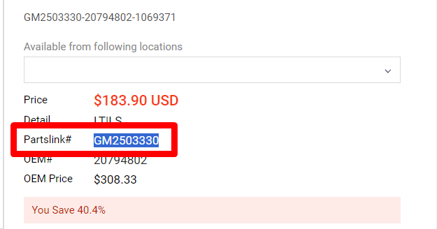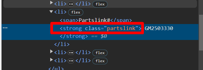 透過 <strong>裡面的class屬性 = "partslink",抓取我要的字串 "GM2503330" 。這一串請務必理解讀懂,這是一句很重要的觀念!