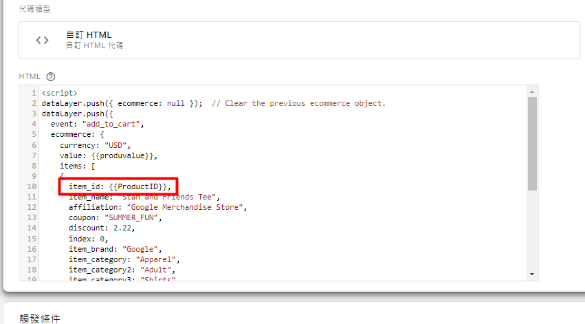 將GA4的官方文件中的DataLayer貼上,並將item_id換成剛剛的變數「{{ProductID}}」即完成。最後可以再回到預覽模式中,看一下是否有成功觸發變數,發送的Html代碼是否也有成功。