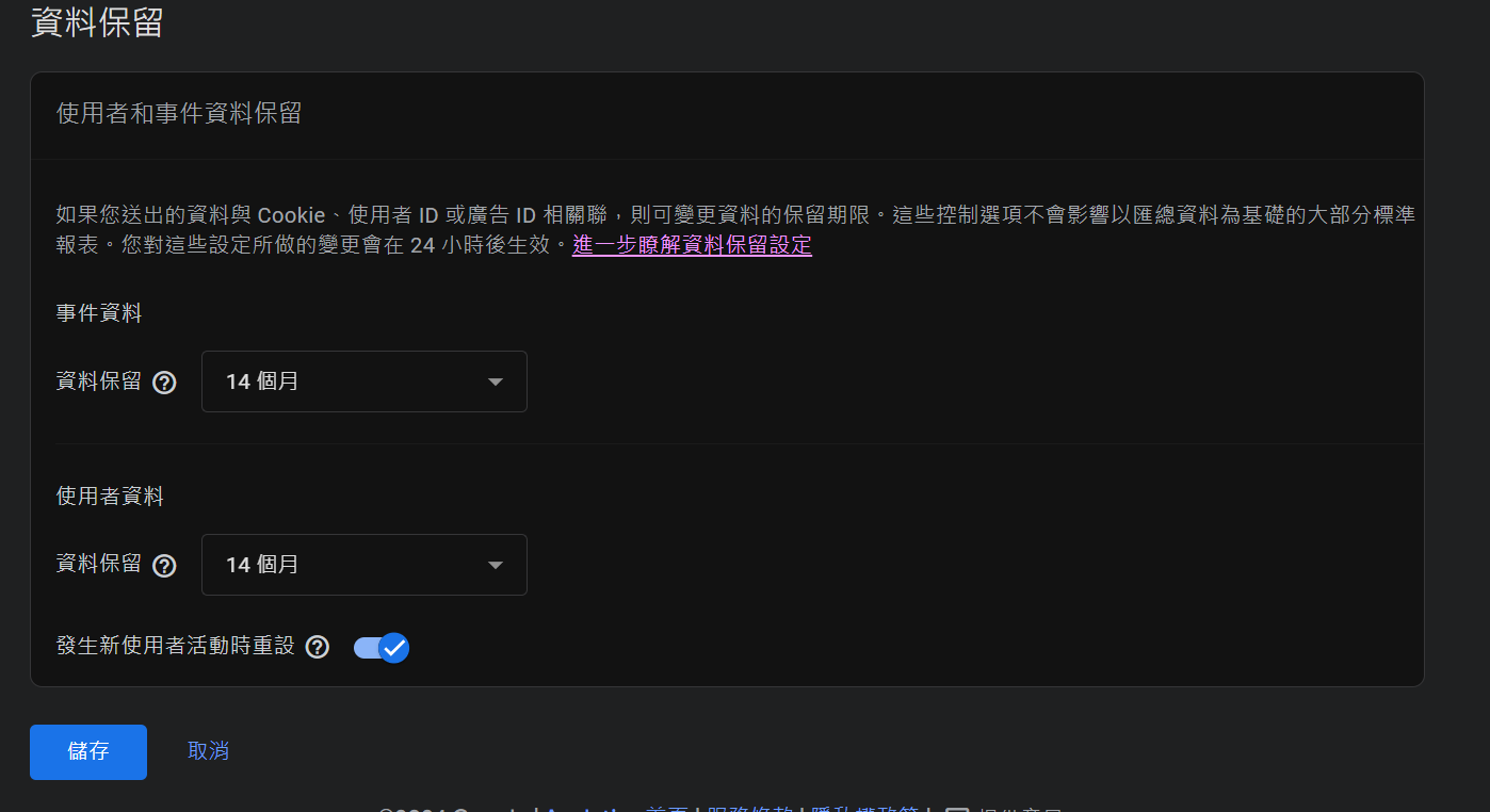 進入資料保留的選項後,再把事件資料、使用者資料,皆改為「14個月」,這樣就可以囉。此設定會於隔天生效。