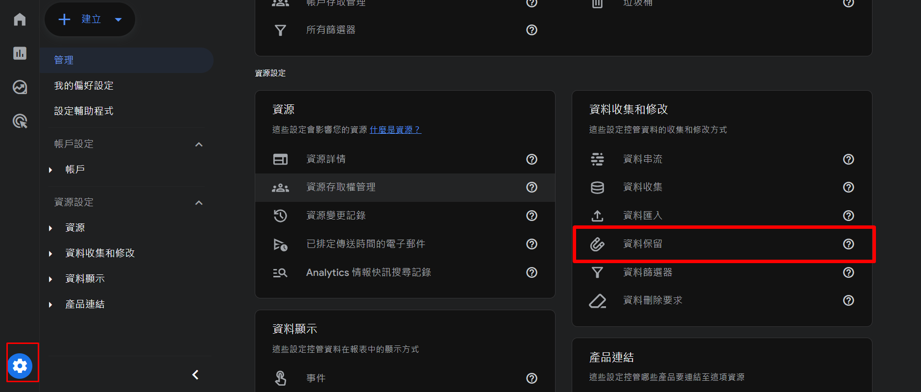 前往GA4下方的齒輪設定,再點選右方選單中的"資料保留",即可看到調整GA4數據保留時間的選項。