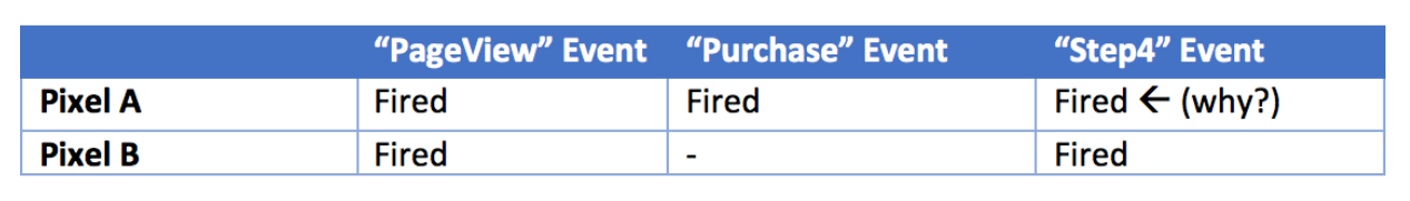 <script> ... base code truncated 'https://connect.facebook.net/en_US/fbevents.js'); fbq('init', '<PIXEL_A>'); fbq('track', 'PageView'); fbq('track', 'Purchase', { 'value': 4, 'currency': 'GBP' }); </script> <script> ... base code truncated 'https://connect.facebook.net/en_US/fbevents.js'); fbq('init', '<PIXEL_B>'); fbq('track', 'PageView'); fbq('trackCustom', 'Step4'); //fires for both Pixel A and B </script> 如上面圖+程式碼示意,當我的Pixel A已經初始化,並完成Pageview, Purchase的送出後。再來接續初始化PixelB,理想中PixelB應該會接收到PageView & Step4。 但反而PIXEL A 也會接收到 Step4。