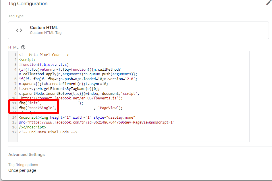 把你的init那個自訂HTML提早觸發。通常網站的JS情況有無限多種,而且不是每一間公司都願意讓我們調整js。因此只能確保初始化在最前面優先執行,後續推送我們要發送的FB PIXEL事件。