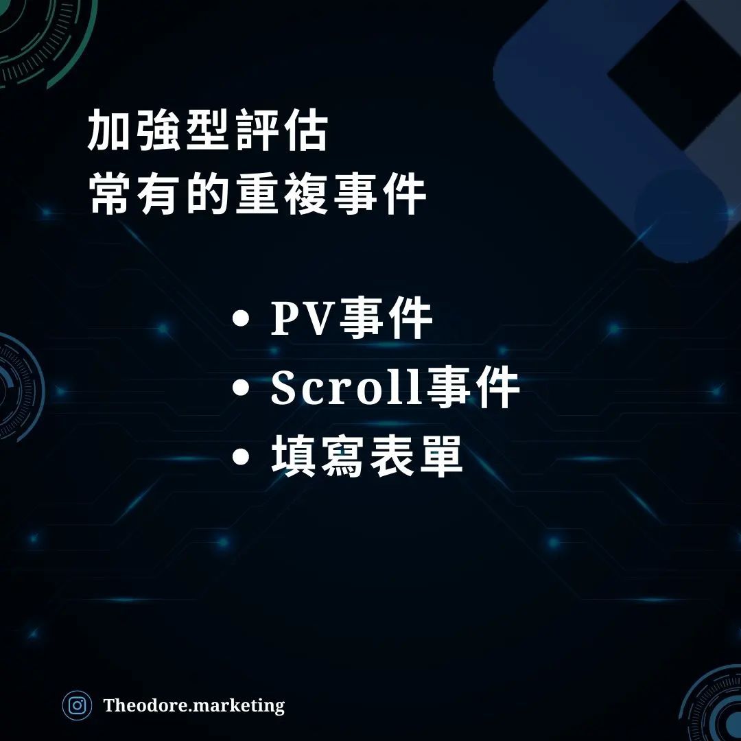 PV事件 / Scroll事件 / 填寫表單 。這幾個是較常跟網站有重複埋設衝突發生的,建議在新增自訂事件時,要留意是否將加強型評估事件關閉。